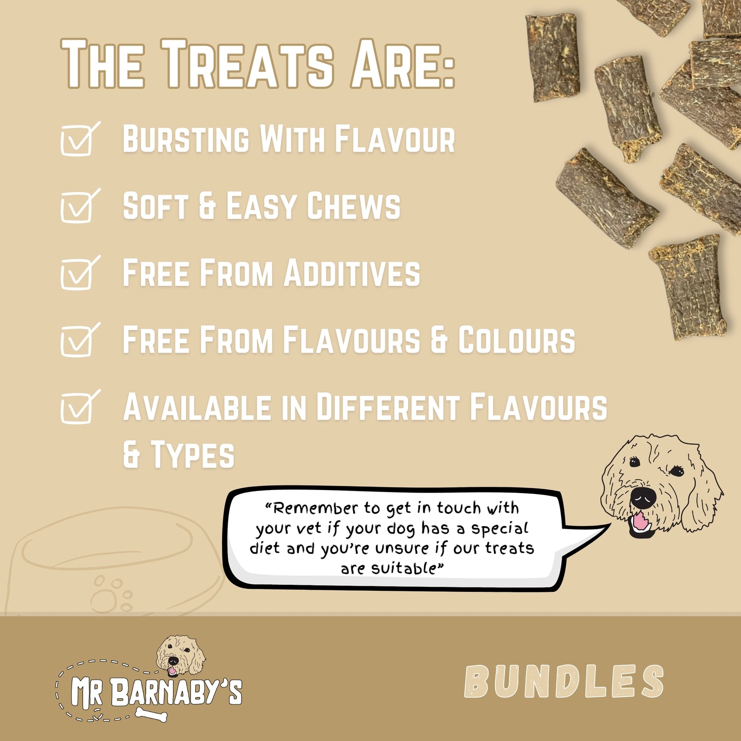 Each bundle typically includes a mix of treat types (bites, mini strips, slices) from Mr Barnaby’s existing lines, giving you variety in one purchase.