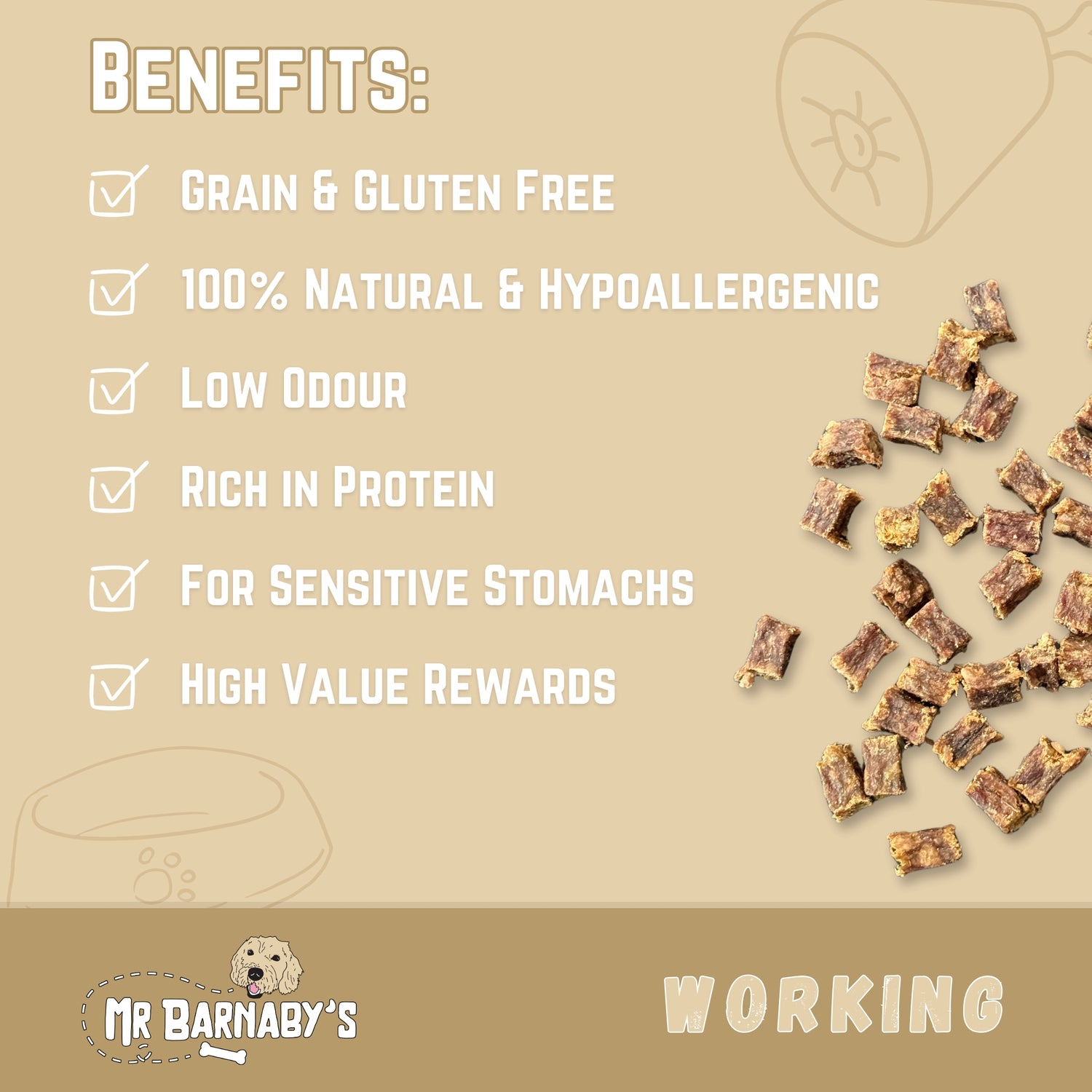 Mr Barnaby’s dog treats for working dogs respond to the unique needs of dogs in active roles. We use premium, bioavailable proteins and avoid unnecessary additives to ensure that every treat supports physical performance without gut compromise. Whether your dog patrols, competes, or assists, this line gives a compact but potent nutritional boost designed for endurance, recovery, and daily resilience all in a grain free, nutrient dense format.