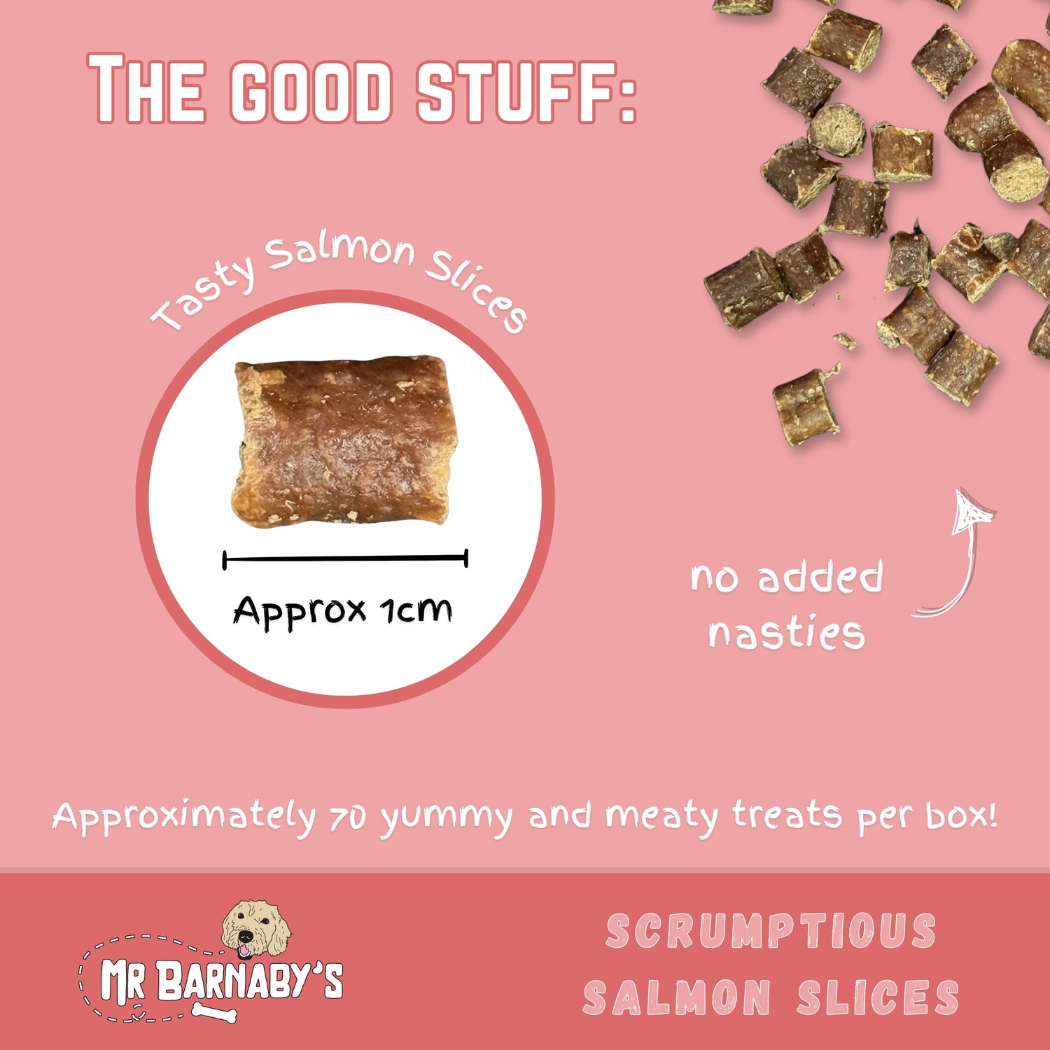 Mr Barnaby’s Scrumptious Salmon Slices are also low in fat, high in protein and excellent for dogs with sensitive stomachs that have specific dietary requirements. As well as that, they’re also hypoallergenic and grain free so are good all-rounder snacks for your pooch. Every single salmon slice is carefully made with love, checked thoroughly and has no added nasties, so that we ensure your furry friend is receiving the best possible treats they
