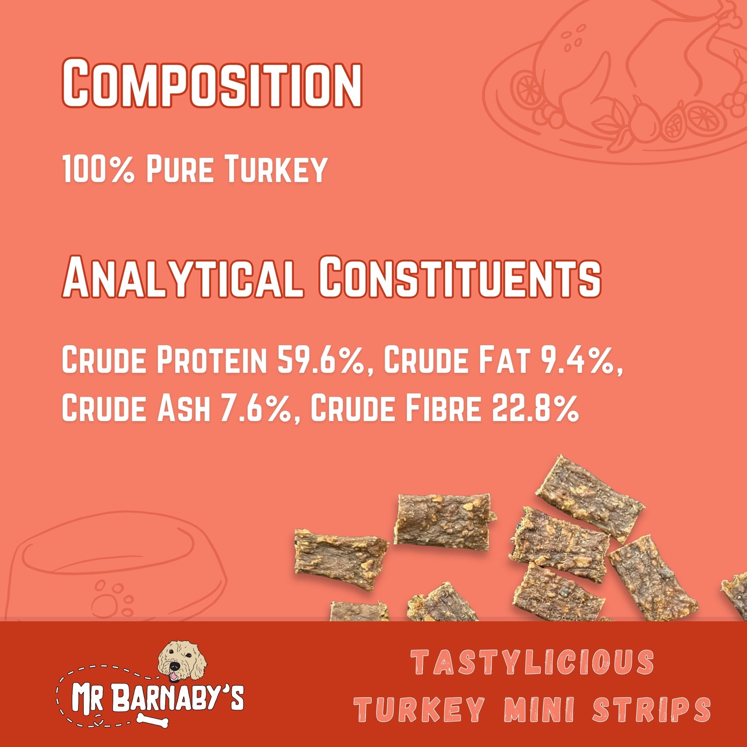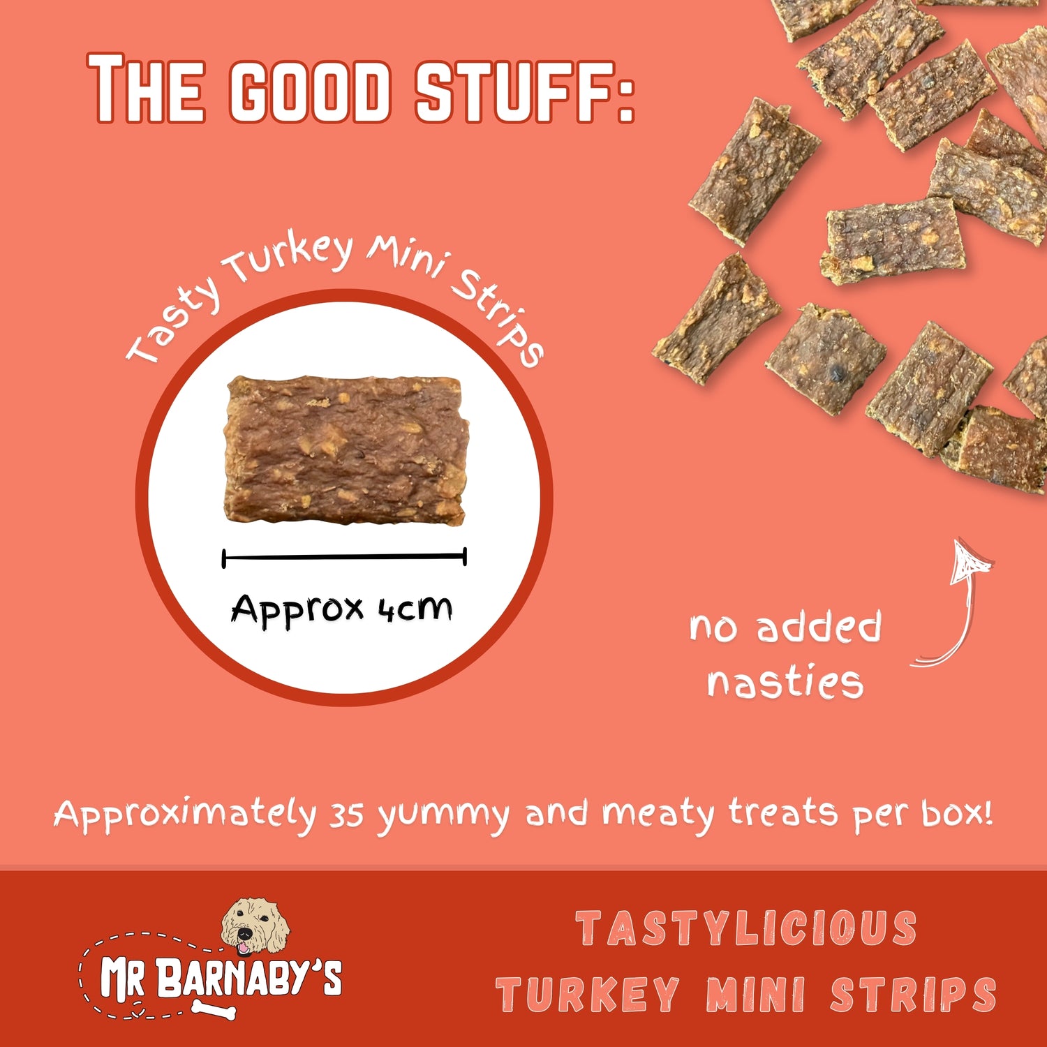 Mr Barnaby’s Tastylicious Turkey Mini Strips are grain free and hypoallergenic natural treats, which means they are a fantastic addition to have in your dog’s diet. Each Turkey Mini Strip is carefully made, checked thoroughly and contains no added nasties so that your dog is only getting the very best for their health and diet.