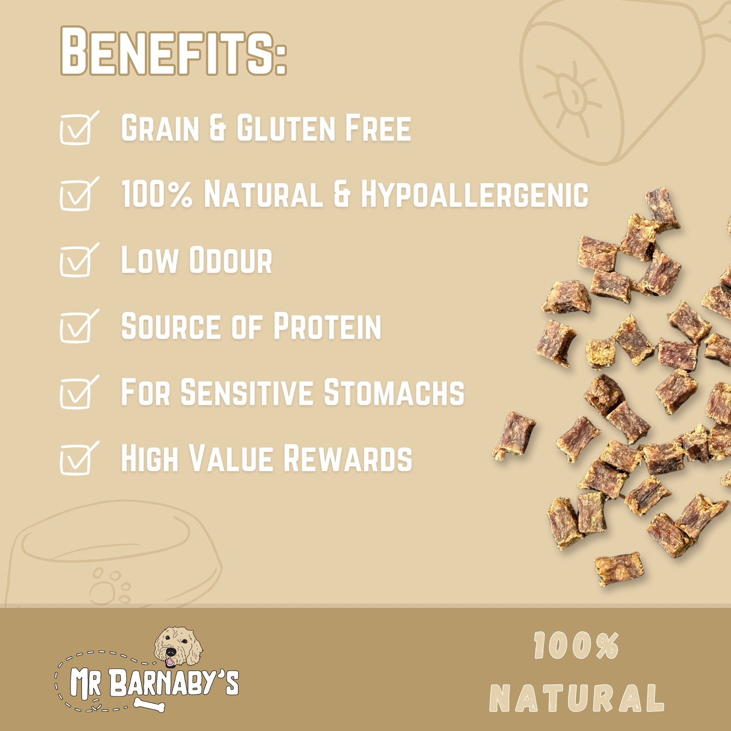 Mr Barnaby’s natural dog treats were born from a belief that dogs deserve snacks as pure as their love. We select premium, carefully sourced proteins and apply gentle processing to maintain flavour and nutrients. With grain free, hypoallergenic recipes, you don’t need to compromise between taste and health. These treats suit active pups, sensitive digestion or just those special bonding moments, all made without artificial nasties.