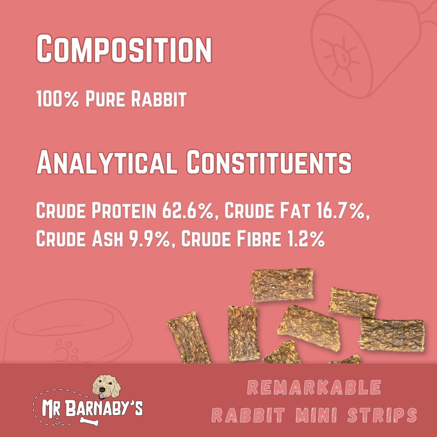 Mr Barnaby’s Remarkable Rabbit Mini Strips are a great choice for dogs with sensitive diets. Each strip is carefully made, quality-checked, and contains no
