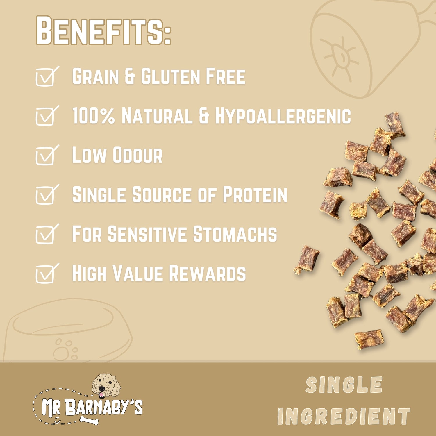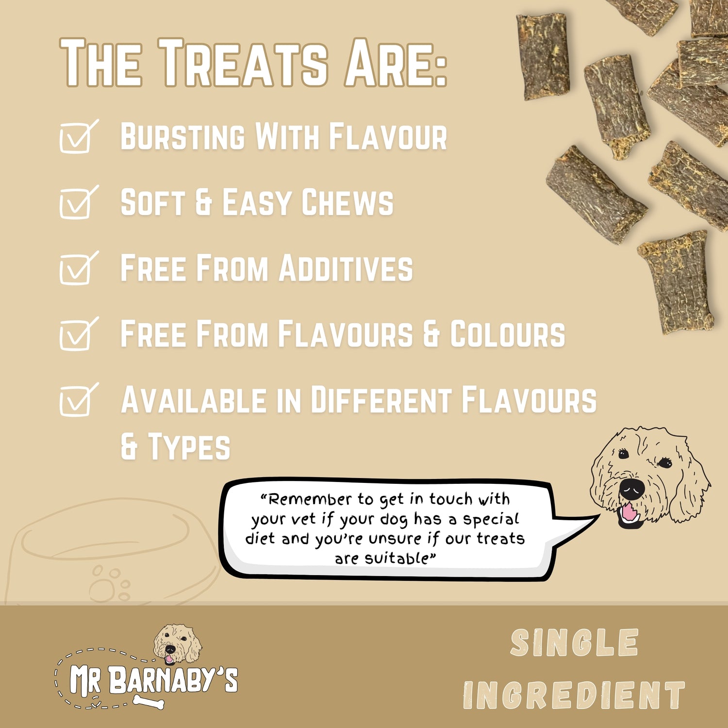 Mr Barnaby’s single ingredient dog treats offer a straightforward approach to canine snacking. By focusing on a single, high quality protein source, these treats eliminate unnecessary fillers and additives, ensuring a pure and digestible option for your dog. Ideal for dogs with food sensitivities or those on specialised diets, our treats provide a clean and natural snack that supports your dog's health and well-being.