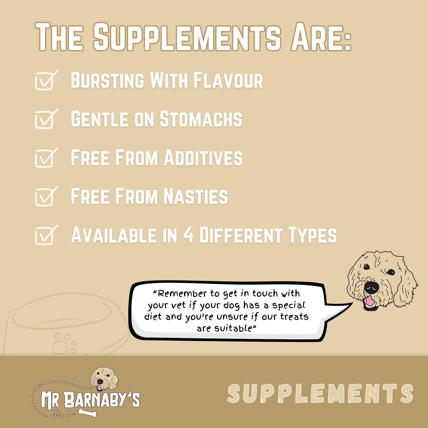 Supplements are intended for wellness support (joints, coat, digestion, dental health) and may have measurable physiological effects, unlike occasional treats.