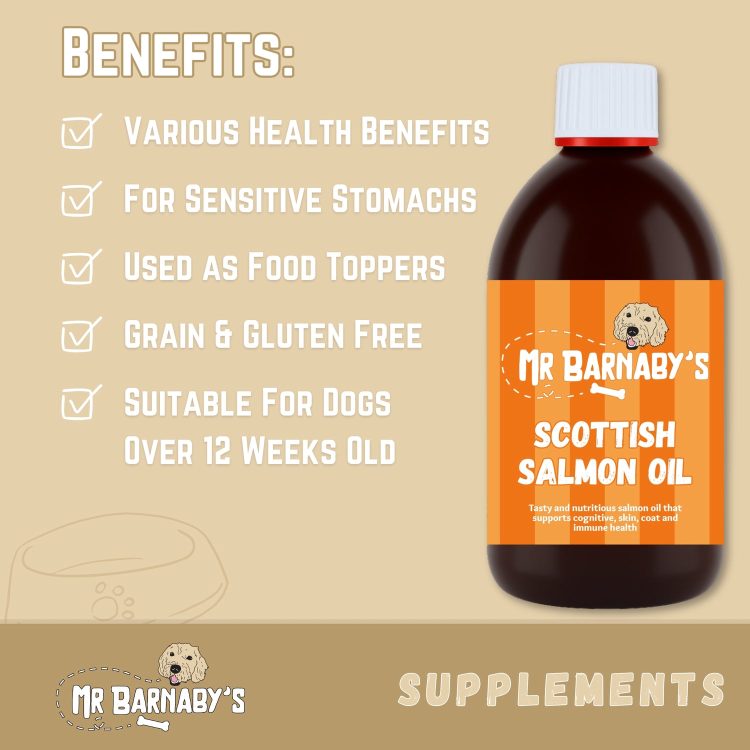 Mr Barnaby’s supplements for dogs bring together five powerful wellness aids, each focused on a specific aspect of canine health. Scottish Salmon Oil (omega-3 rich) to support skin, coat, inflammation balance and cardiovascular health. Green-Lipped Mussel Powder, known for its anti-inflammatory and joint support properties, with natural omega-3, glucosamine, and chondroitin. Deer Antler Powder, a nutrient-dense, natural calcium and collagen source which may support joint and muscle health. Plaque Remover Powder (oral supplement), formulated to reduce plaque, freshen breath, and promote gum health. Prebiotic / Probiotic / Postbiotic formula, designed to foster digestive balance, support immunity, and maintain gut flora. Each supplement is grain-free, free from artificial colours or flavours, and intended to integrate seamlessly into your dog’s daily routine for long-term wellness.
