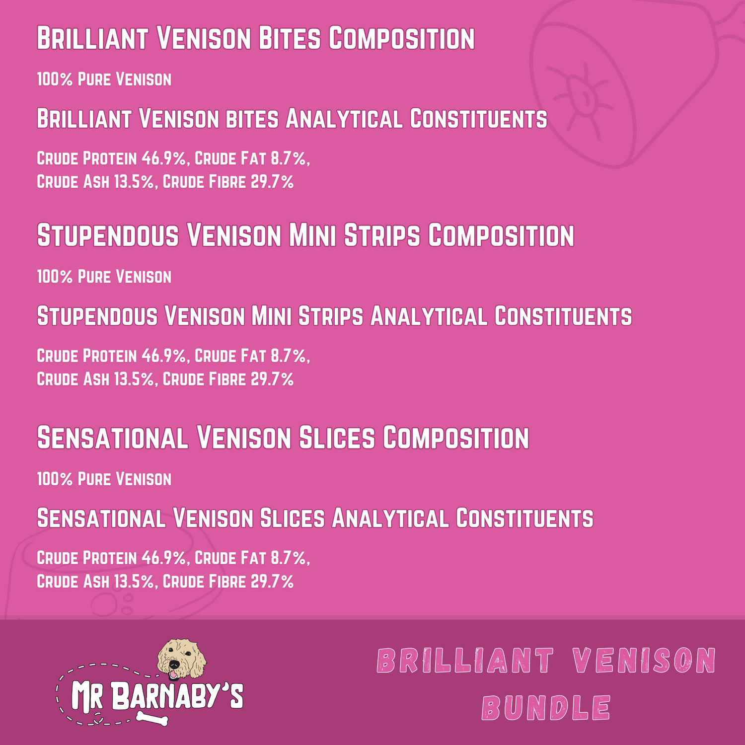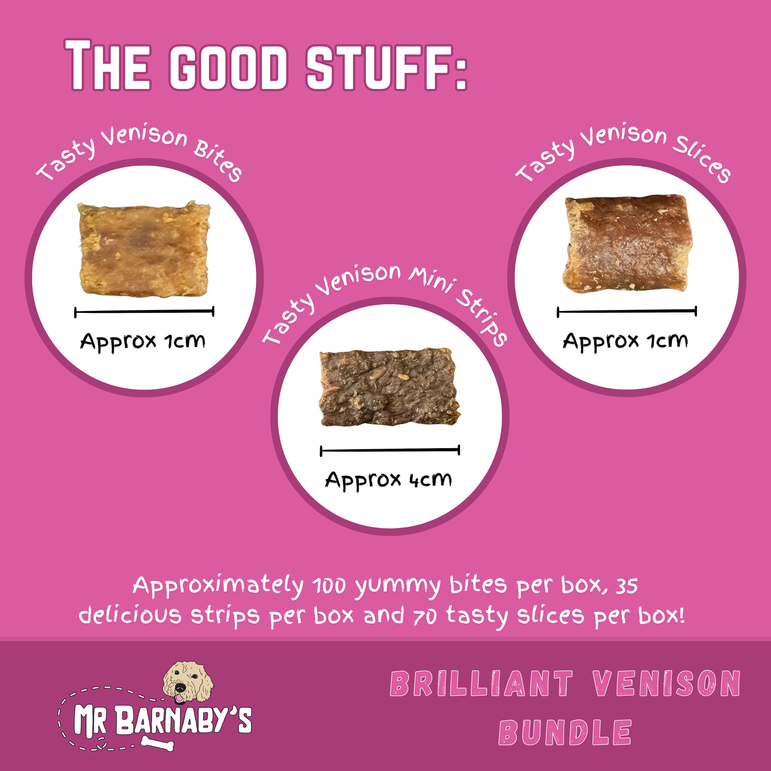 The brilliant venison bundle is a premium selection of air-dried treats made with 100% natural venison. Featuring venison bites, venison mini strips, and venison slices, this bundle offers a tasty variety of textures and is perfect for dogs who enjoy rich, gamey flavours.