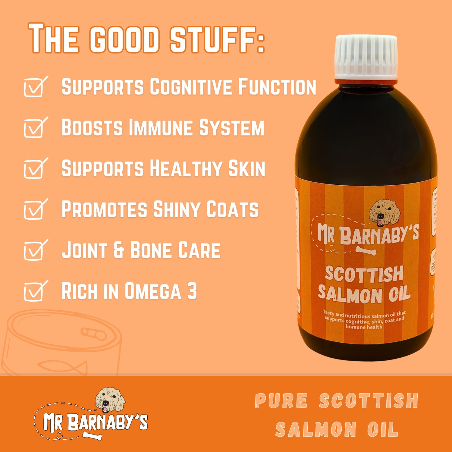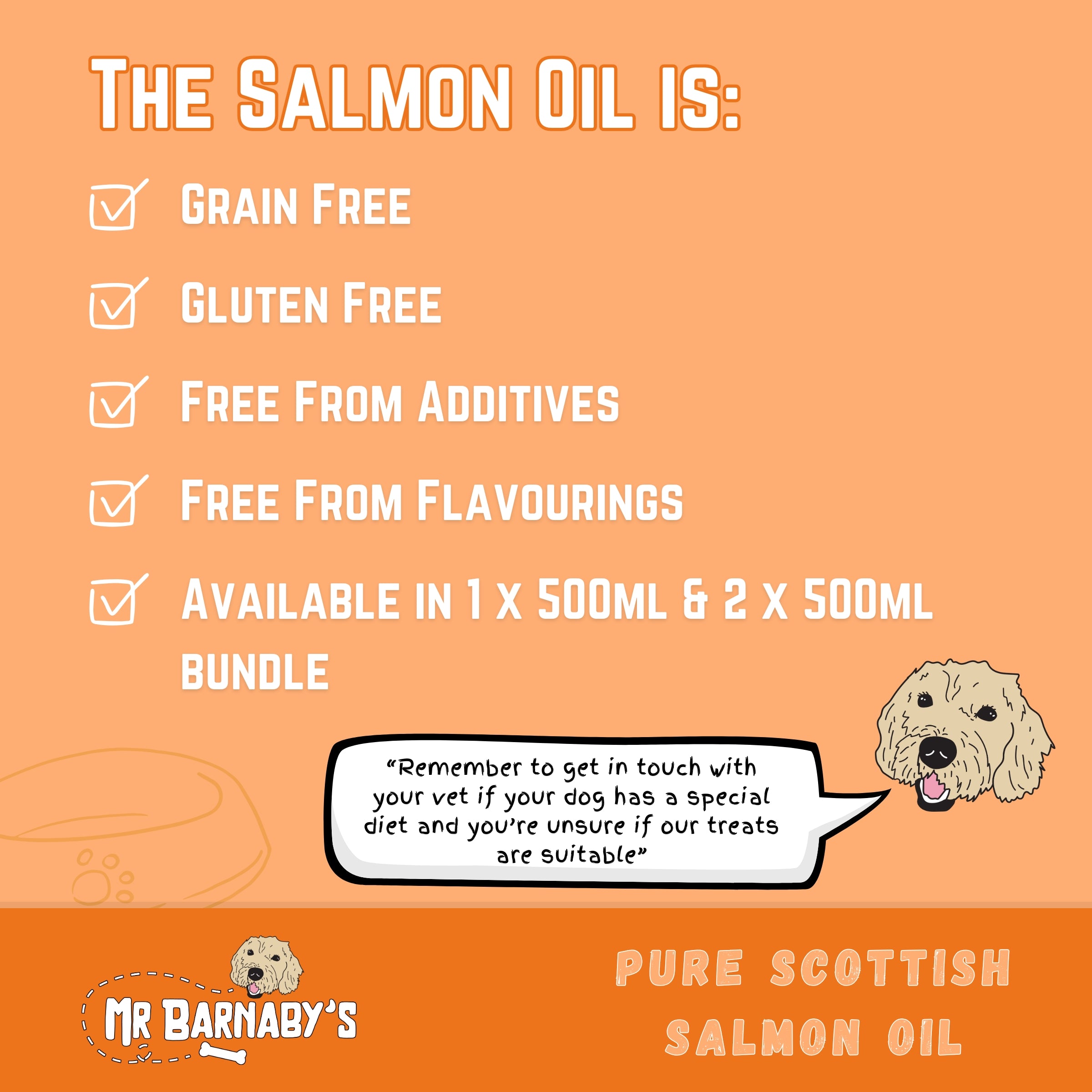 Give your dog the natural boost they deserve with our Pure Scottish Salmon Oil for Dogs. Packed with omega-3, 6 & 9 fatty acids, it supports healthy skin, a shiny coat, flexible joints, and overall wellbeing. 100% pure, sustainably sourced, and free from additives, a simple way to keep your dog looking and feeling their best every day.